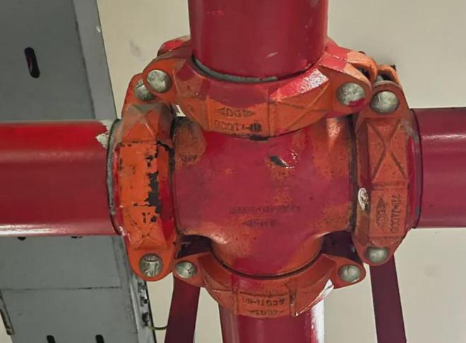 审核审计结算报告显示防水卷帘门更换了27樘,但每经记者在地下车库注意到,部分消防卷帘门没有标牌,部分有生产厂家但没有新装的痕迹,仅部分卷帘门更换了。消防管道、消防泵等并不是换新后的材料,只是表面被刷了红漆或蓝漆。